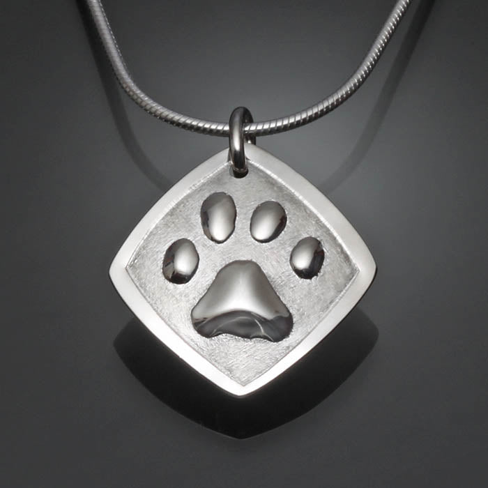 Pets are such an important part of people’s lives. This is our tribute to their faithful companionship. This embossed foot pad pendant design has been a favorite at art fairs and we're pleased to present it now for our website customers. This pendant is 5/8" square and comes on a 1mm sterling silver snake chain.